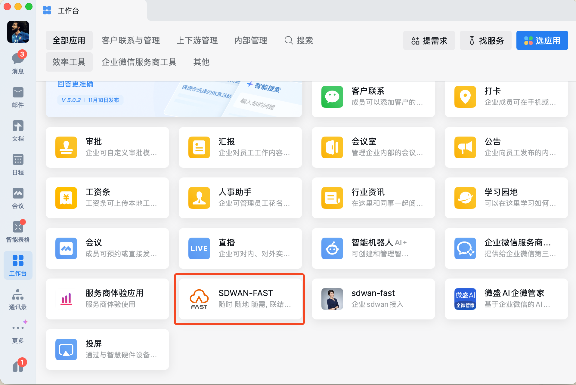 在 企业微信客户端,打开工作台,找到 SDWAN-FAST 应用并点击进入。 如果没有 SDWAN-FAST 应用,请联系你的组织管理员添加该应用到工作台。