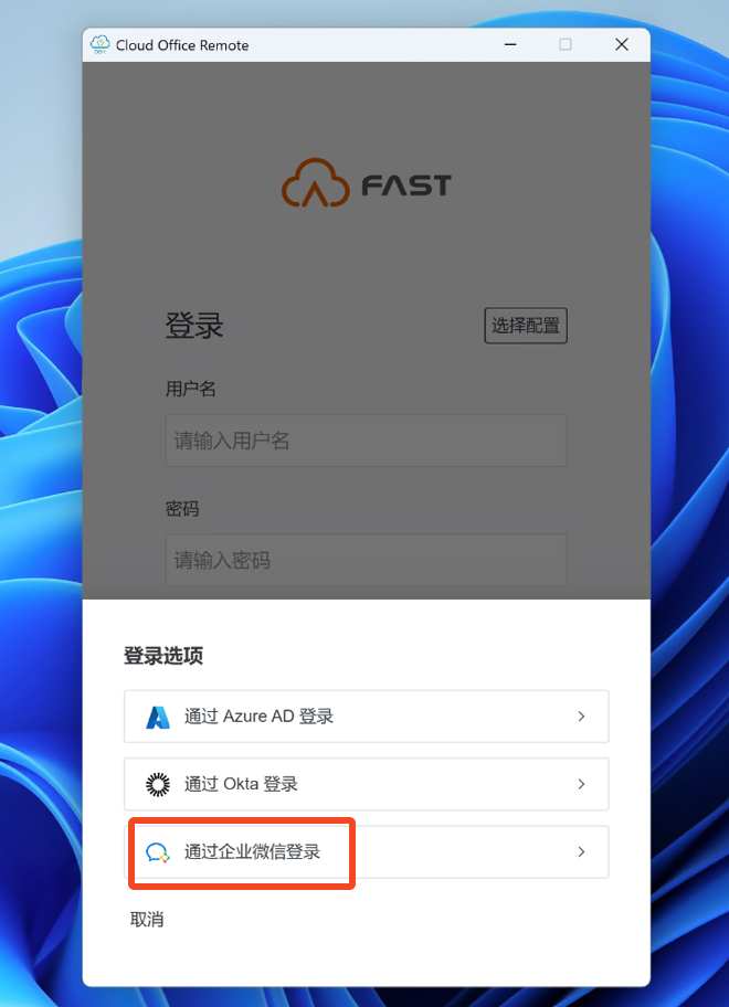 在企业微信客户端中,完成身份授权后,打开 SDWAN-FAST 应用 的设置页面,选择 企业微信 作为登录方式。